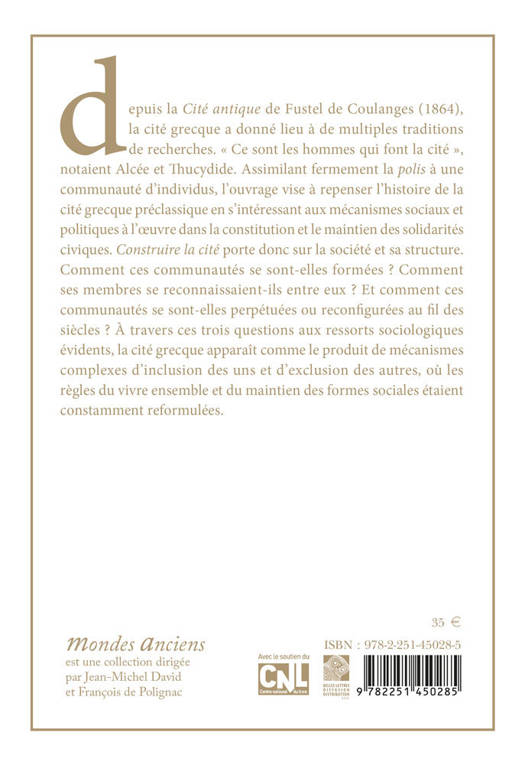 Depuis la Cite antique de Fustel de Coulanges (1864), la cite grecque a donne lieu a de multiples traditions de recherches. Ce sont les hommes qui font la cite , notaient Alcee et Thucydide. Assimilant fermement la polis a une communaute d'individus, l'ouvrage vise a repenser l'histoire de la cite grecque preclassique en s'interessant aux mecanismes sociaux et politiques a l'oeuvre dans la constitution et le maintien des solidarites civiques. Construire la cite porte donc sur la societe et sa structure. Comment ces communautes se sont-elles formees ? Comment ses membres se reconnaissaient-ils entre eux ? Et comment ces communautes se sont-elles perpetuees ou reconfigurees au fil des siecles ? A travers ces trois questions aux ressorts sociologiques evidents, la cite grecque apparait comme le produit de mecanismes complexes d'inclusion des uns et d'exclusion des autres, ou les regles du vivre ensemble et du maintien des formes sociales etaient constamment reformulees.