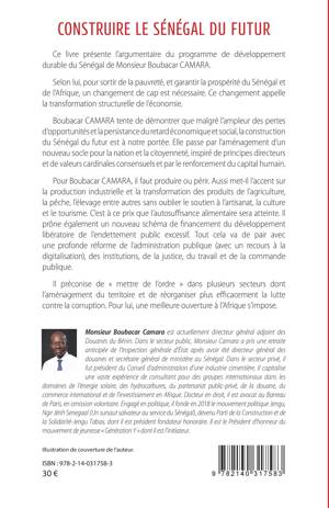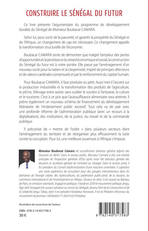 Ce livre présente l'argumentaire du programme de développement durable du Sénégal de Monsieur Boubacar CAMARA. Selon lui, pour sortir de la pauvreté, et garantir la prospérité du Sénégal et de l'Afrique, un changement de cap est nécessaire. Ce changement appelle la transformation structurelle de l'économie. Boubacar CAMARA tente de démontrer que malgré l'ampleur des pertes d'opportunités et la persistance du retard économique et social, la construction du Sénégal du futur est à notre portée. Elle passe par l'aménagement d'un nouveau socle pour la nation et la citoyenneté, inspiré de principes directeurs et de valeurs cardinales consensuels et par le renforcement du capital humain. Il préconise de « mettre de l'ordre » dans plusieurs secteurs dont l'aménagement du territoire et de réorganiser plus efficacement la lutte contre la corruption. Pour lui, une meilleure ouverture à l'Afrique s'impose.