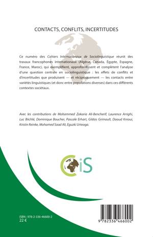 Ce numéro des Cahiers Internationaux de Sociolinguistique réunit des travaux francophones internationaux (Algérie, Canada, Égypte, Espagne, France, Maroc), qui exemplifient, approfondissent et complètent l’analyse d’une question centrale en sociolinguistique : les effets de conflits et d’incertitudes que produisent — et réciproquement — les contacts entre variétés linguistiques (et donc entre populations diverses) dans ces différents contextes sociétaux.