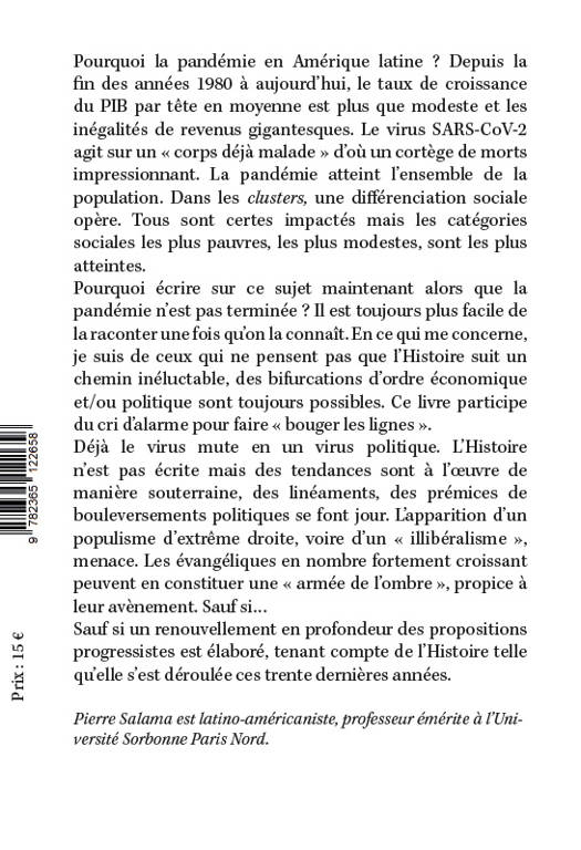 Pourquoi la pandémie en Amérique latine ? Le virus SARS-CoV-2 agit sur un « corps déjà malade » d'où un cortège de morts impressionnant. La pandémie atteint l'ensemble de la population. Tous sont certes impactés mais les catégories sociales les plus pauvres, les plus modestes, sont les plus atteintes. Pourquoi écrire sur ce sujet maintenant alors que la pandémie n'est pas terminée ? Déjà le virus mute en un virus politique. L'Histoire n'est pas écrite mais des tendances sont à l'Åuvre de manière souterraine, des linéaments, des prémices de bouleversements politiques se font jour. L'apparition d'un populisme d'extrême droite, voire d'un « illibéralisme », menace. Les évangéliques en nombre fortement croissant peuvent en constituer une « armée de l'ombre », propice à leur avènement. Sauf si⦠Sauf si un renouvellement en profondeur des propositions progressistes est élaboré, tenant compte de l'Histoire telle qu'elle s'est déroulée ces trente dernières années.