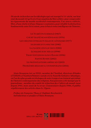 50 ans de recherches sur les ideologies qui ont marque le XXe siecle, sur leur rejet du monde tel qu'il est et leur negation du libre arbitre, pour comprendre les egarements du monde occidental contemporain. Une oeuvre cultivee, libre, d'une clarte et d'une elegance constantes, pour retablir la distinction fondamentale entre foi et raison, pour eclaircir notre intelligence de l'histoire.