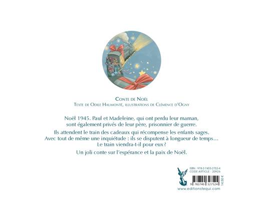 Noël 1945. Paul et Madeleine, orphelins de mère, sont également privés de leur père qui a été fait prisonnier en 1941. En ce premier Noël de l'Après-guerre, ils attendent avec impatience le passage du train des cadeaux qui récompense les enfants sages. Avec tout de même une petite inquiétude : ils se disputent à longueur de temps ! Le train viendra-t-il pour eux ? La guerre est vue par les yeux des enfants à travers les différents trains : le train des soldats qui partent à la guerre, le train des déportés juifs, le train des prisonniers allemands qui partent, le train des prisonniers français qui reviennent… et le train des cadeaux, symbole de l'espérance. Un joli conte, illustré avec une grande délicatesse par Clémence d'Ogny, sur l'espérance et la paix de Noël.