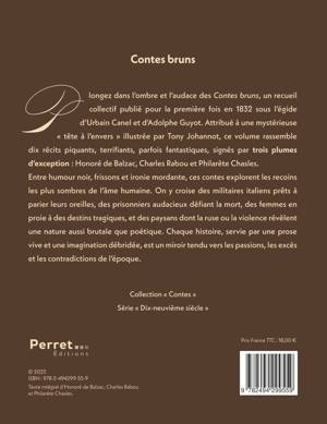 Plongez dans l'ombre et l'audace des Contes bruns, un recueil collectif publié pour la première fois en 1832 sous l'égide d'Urbain Canel et d'Adolphe Guyot. Attribué à une mystérieuse « tête à l'envers » illustrée par Tony Johannot, ce volume rassemble dix récits piquants, terrifiants, parfois fantastiques, signés par trois plumes d'exception : Honoré de Balzac, Charles Rabou et Philarète Chasles. Entre humour noir, frissons et ironie mordante, ces contes explorent les recoins les plus sombres de l'âme humaine. On y croise des militaires italiens prêts à parier leurs oreilles, des prisonniers audacieux défiant la mort, des femmes en proie à des destins tragiques, et des paysans dont la ruse ou la violence révèlent une nature aussi brutale que poétique. Chaque histoire, servie par une prose vive et une imagination débridée, est un miroir tendu vers les passions, les excès et les contradictions de l'époque.