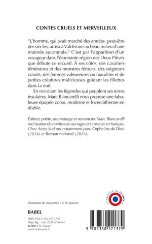 "L'homme, qui avait marché des années, peut-être des siècles, arriva à Valderone au beau milieu d'une matinée automnale." C'est par l'apparition d'un voyageur dans l'étonnante région des Deux Pièves que débute ce recueil. À ses côtés, des cavaliers téméraires et des monstres féroces, des seigneurs craints, des femmes valeureuses ou maudites et de petites créatures malicieuses guidant les fillettes dans la nuit. En revisitant les légendes qui peuplent ses terres insulaires, Marc Biancarelli nous propose une fabuleuse épopée corse, moderne et lovecraftienne en diable.