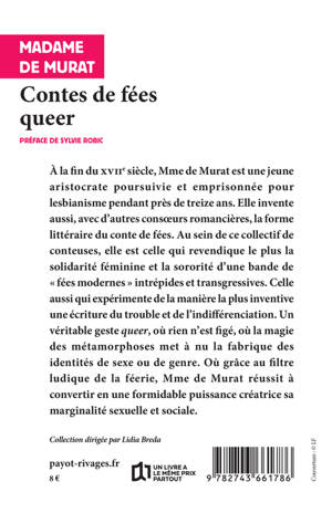 À la fin du XVIIe siècle, Mme de Murat est une jeune aristocrate poursuivie et emprisonnée pour lesbianisme pendant près de treize ans. Elle invente aussi, avec d'autres consoeurs romancières, la forme littéraire du conte de fées. Au sein de ce collectif de conteuses, elle est celle qui revendique le plus la solidarité féminine et la sororité d'une bande de « fées modernes » intrépides et transgressives. Celle aussi qui expérimente de la manière la plus inventive une écriture du trouble et de l'indifférenciation. Un véritable geste queer, où rien n'est figé, où la magie des métamorphoses met à nu la fabrique des identités de sexe ou de genre. Où grâce au filtre ludique de la féerie, Mme de Murat réussit à convertir en une formidable puissance créatrice sa marginalité sexuelle et sociale.