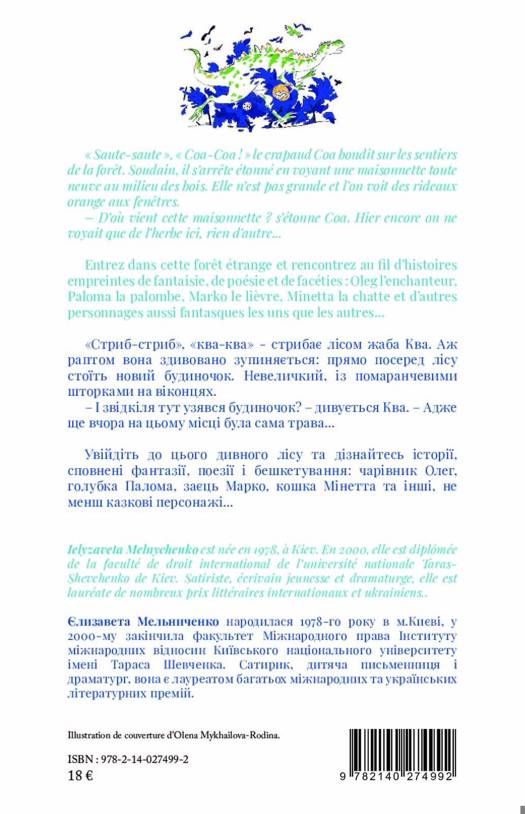 « Saute-saute », « Coa-Coa ! » le crapaud Coa bondit sur les sentiers de la forêt. Soudain, il s'arrête étonné en voyant une maisonnette toute neuve au milieu des bois. Elle n'est pas grande et l'on voit des rideaux orange aux fenêtres. - D'où vient cette maisonnette ? s'étonne Coa. Hier encore on ne voyait que de l'herbe ici, rien d'autre... Entrez dans cette forêt étrange et rencontrez au fil d'histoires empreintes de fantaisie, de poésie et de facéties : Oleg l'enchanteur, Paloma la palombe, Marko le lièvre, Minetta la chatte et d'autres personnages aussi fantasques les uns que les autres...