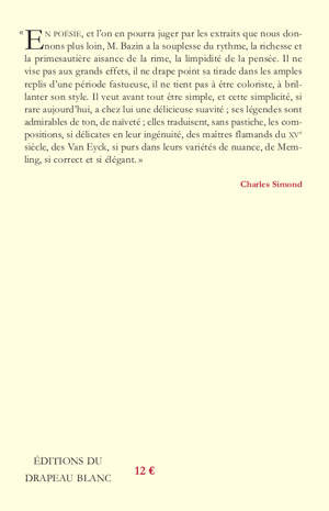 En poésie, et l'on en pourra juger par les extraits que nous donnons plus loin, M. Bazin a la souplesse du rythme, la richesse et la primesautière aisance de la rime, la limpidité de la pensée. Il ne vise pas aux grands effets, il ne drape point sa tirade dans les amples replis d'une période fastueuse, il ne tient pas à être coloriste, à brillanter son style. Il veut avant tout être simple, et cette simplicité, si rare aujourd'hui, a chez lui une délicieuse suavité, ses légendes sont admirables de ton, de naïveté, elles traduisent, sans pastiche, les compositions, si délicates en leur ingénuité, des maîtres flamands du XVe siècle, des Van Eyck, si purs dans leurs variétés de nuance, de Memling, si correct et si élégant (Charles Simond).