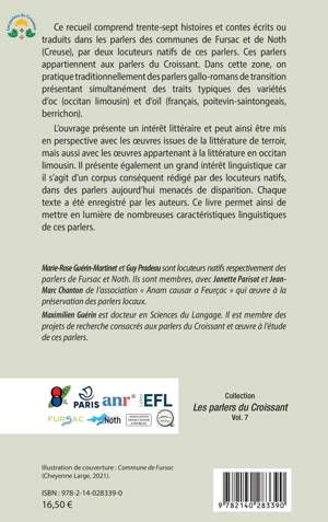 Ce recueil comprend trente-sept histoires et contes écrits ou traduits dans les parlers des communes de Fursac et de Noth (Creuse), par deux locuteurs natifs de ces parlers. Ces parlers appartiennent aux parlers du Croissant. Dans cette zone, on pratique traditionnellement des parlers gallo-romans de transition présentant simultanément des traits typiques des variétés d'oc (occitan limousin) et d'oïl (français, poitevin-saintongeais, berrichon). L'ouvrage présente un intérêt littéraire et peut ainsi être mis en perspective avec les oeuvres issues de la littérature de terroir, mais aussi avec les oeuvres appartenant à la littérature en occitan limousin. Il présente également un grand intérêt linguistique car il s'agit d'un corpus conséquent rédigé par des locuteurs natifs, dans des parlers aujourd'hui menacés de disparition.