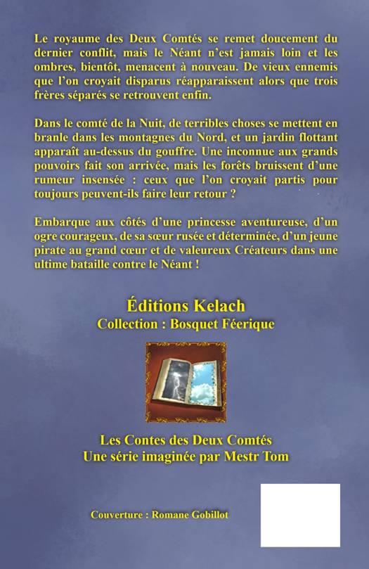 Le royaume des Deux Comtés se remet doucement du dernier conflit, mais le Néant n'est jamais loin et les ombres, bientôt, menacent à nouveau. De vieux ennemis que l'on croyait disparus réapparaissent alors que trois frères séparés se retrouvent enfin. Dans le comté de la Nuit, de terribles choses se mettent en branle dans les montagnes du Nord, et un jardin flottant apparaît au-dessus du gouffre. Une inconnue aux grands pouvoirs fait son arrivée, mais les forêts bruissent d'une rumeur insensée : ceux que l'on croyait partis pour toujours peuvent-ils faire leur retour ? Embarque aux côtés d'une princesse aventureuse, d'un ogre courageux, de sa soeur rusée et déterminée, d'un jeune pirate au grand coeur et de valeureux Créateurs dans une ultime bataille contre le Néant !