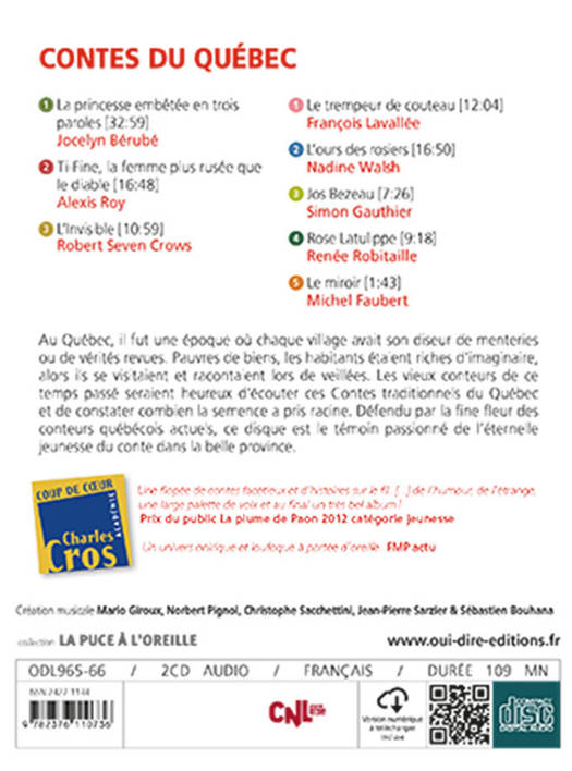 Imaginez-vous au Québec à l'orée d'une forêt, quelques ours cachés dans les fourrés. Là-bas, les princesses ne sont pas nées de la dernière averse, les trempeurs de couteau sont bons comme le pain, le diable vous invite à danser et Jos Bezeau connaît la réponse à toutes les questions... Défendu par la fine fleur des conteurs québécois actuels, cet album est le témoin passionné de l'éternelle jeunesse du conte dans la belle province.