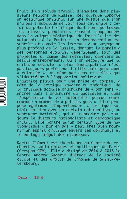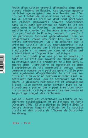 Les conclusions présentées dans cet ouvrage s’appuient sur une enquête de terrain effectuée en 2016-2018, dirigée par l’auteure, et consacrée initialement au nationalisme ordinaire en Russie contemporaine1. Ce n’est que dans un deuxième temps que la problématique de la critique sociale ordinaire s’est imposée comme nécessaire pour éclairer toute la richesse des données collectées. Cette enquête a été menée avec l’aide d’étudiants et collègues de la Faculté des Arts libéraux et des sciences de l’Université d’Etat de St-Pétersbourg2 qui ont pris en charge certains entretiens ou certaines notes de synthèse. Les guides d’entretien, les premières impressions et premiers résultats ont été discutés collectivement. Je porte cependant l’entière responsabilité de l’analyse et de l’interprétation des données. Une évolution de l’objet L’enquête avait été pensée pour étudier le nationalisme ordinaire ou le rapport à la nation tel qu’il s’exprime au sein de catégories sociales différentes et dans p