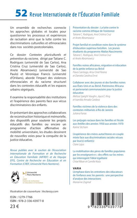 Un ensemble de recherches connecte les approches globales et locales pour questionner les processus et expériences de racisation ainsi que la lutte contre les discriminations culturelles et ethnoraciales dans nos sociétés postcoloniales. Ce dossier Contextes pluriculturels et prévention du racisme, dirigé par Tatiane C. Rodrigues (université de Sao Carlos), Ana Cristina Cruz (université de Sao Carlos), Anete Abramowicz (université de Sao Paulo) et Véronique Francis (université d’Orléans), aborde l’impact des violences ethnoraciales et du racisme structurel dans les contextes éducatifs et les espaces urbains ségrégués. Il examine la responsabilité des institutions et l’expérience des parents face aux vécus discriminatoires des enfants. En présentant des approches collaboratives de reconstruction historique et mémorielle, des dispositifs pour soutenir les projets éducatifs des familles ou encore un programme d’action affirmative de mobilité universitaire, les études dessinent de nouvelles voies pour la conquête de la justice éducative.