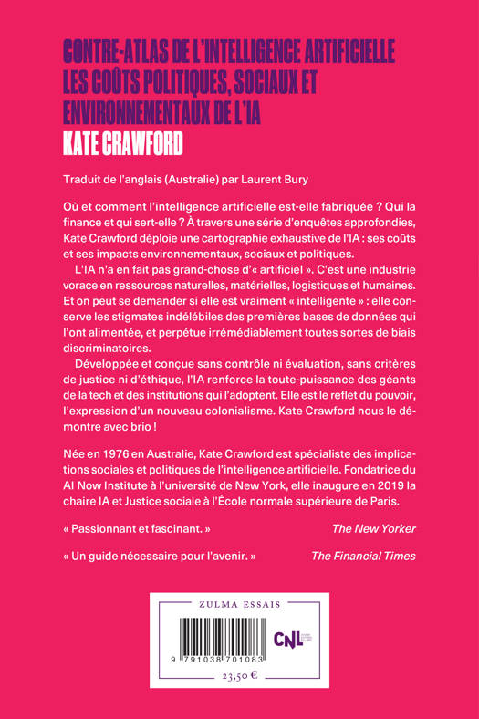 Développée et conçue sans contrôle ni évaluation, sans critères de justice ni d'éthique, l'IA renforce la toute-puissance des géants de la tech et des institutions qui l'adoptent. Elle est le reflet du pouvoir, l'expression d'un nouveau colonialisme. Kate Crawford nous le démontre avec brio !
