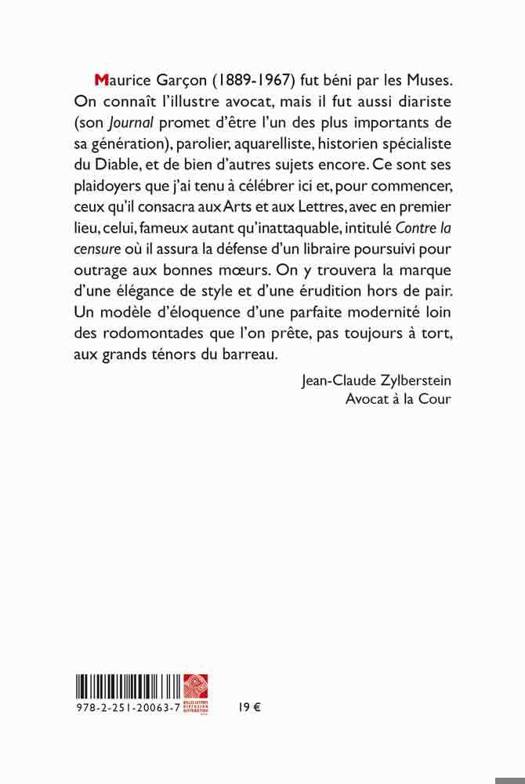Maurice Garcon (1889-1967) fut beni par les Muses. On connait l'illustre avocat, mais il fut aussi diariste (son Journal dont la publication a ete entamee par les Belles lettres promet d'etre l'un des plus importants de sa generation), parolier, aquarelliste, historien specialiste du Diable, et sans doute bien d'autres choses encore. Ce sont ses plaidoyers que l'on va celebrer dans la collection Le gout des idees et, pour commencer, ceux qu'il consacra aux arts et aux lettres, avec en premier lieu, celui, celebre, intitule desormais Contre la censure ou il assura la defense d'un libraire poursuivi pour outrage aux bonnes moeurs. On y trouvera la marque d'une elegance de style et d'une erudition hors de pair: un modele d'eloquence d'une parfaite modernite loin des rodomontades que l'on prete, pas toujours a tort, aux grands tenors du barreau.Jean-Claude Zylberstein, Avocat a la Cour
