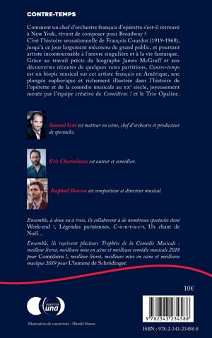 Comment un chef d'orchestre français d'opérette s'est-il retrouvé à New York, rêvant de composer pour Broadway ? C'est l'histoire sensationnelle de François Courdot (1919-1968), jusqu'à ce jour largement méconnu du grand public, et pourtant artiste incontournable à l'oeuvre singulière et à la vie fantasque. Grâce au travail précis du biographe James McGraff et aux découvertes récentes de quelques rares partitions, Contre-temps est un biopic musical sur cet artiste français en Amérique, une plongée euphorique et richement illustrée dans l'histoire de l'opérette et de la comédie musicale au XXe siècle, joyeusement menée par l'équipe créative de Comédiens! et le Trio Opaline.
