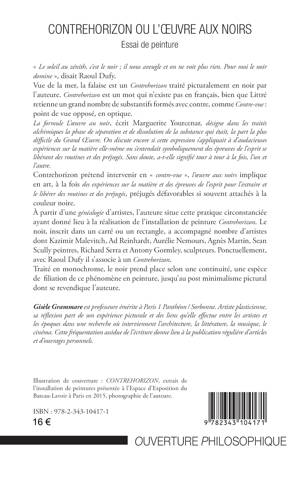 Contrehorizon prétend intervenir en "contre-vue", l'œuvre aux noirs implique en art, à la fois des expériences sur la matière et des épreuves de l'esprit pour l'extraire et le libérer des routines et des préjugés, préjugés défavorables si souvent attachés à la couleur noire. À partir d'une généalogie d'artistes, l'auteure situe cette pratique circonstanciée ayant donné lieu à la réalisation de l'installation de peinture Contrehorizon. Le noir, inscrit dans un carré ou un rectangle, a accompagné nombre d'artistes. Traité en monochrome, il prend place selon une continuité, jusqu'au post minimalisme pictural dont se revendique l'auteure.