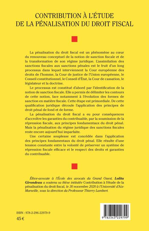 La pénalisation du droit fiscal est un phénomène au coeur du renouveau conceptuel de la notion de sanction fiscale et de la transformation de son régime juridique. L'assimilation des sanctions fiscales aux sanctions pénales est le fruit d'un long processus dans lequel interviennent la Cour européenne des droits de l'homme, la Cour de justice de l'Union européenne, le Conseil constitutionnel, le Conseil d'État, la Cour de cassation, le législateur et la doctrine. Le processus est constitué d'abord par l'identification de la notion de sanction fiscale. Elle a permis d'en délimiter les contours, face notamment à l'évolution des formes de sanction en matière fiscale. De cette qualification juridique découle l'application des principes de droit pénal de fond et de forme. La pénalisation du droit fiscal a eu pour conséquences d'accroître les garanties du contribuable. Mais la pénalisation du régime juridique des sanctions fiscales reste encore aujourd'hui imparfaite. Une certaine souplesse est concédée dans l'application des principes fondamentaux du droit pénal. Elle résulte d'une tension constante entre la volonté de préserver un système de répression fiscale efficace et le respect des droits et garanties du contribuable.