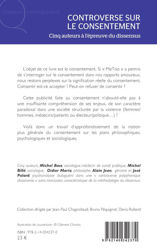 L'objet de ce livre est le consentement. Si « MeToo » a permis de s'interroger sur le consentement dans nos rapports amoureux, nous restons perplexes sur la signification réelle du consentement. Consentir est-ce accepter ? Peut-on refuser de consentir ? Cette publicité faite au consentement n'aboutit-elle pas à une insuffisante compréhension de ses enjeux, de son caractère paradoxal dans une société structurée par la violence (femmes/hommes, médecins/patients ou électeur/politique ) ? Voilà donc un travail d'approfondissement de la notion plus générale du consentement sur les plans philosophiques, psychologiques et sociologiques.
