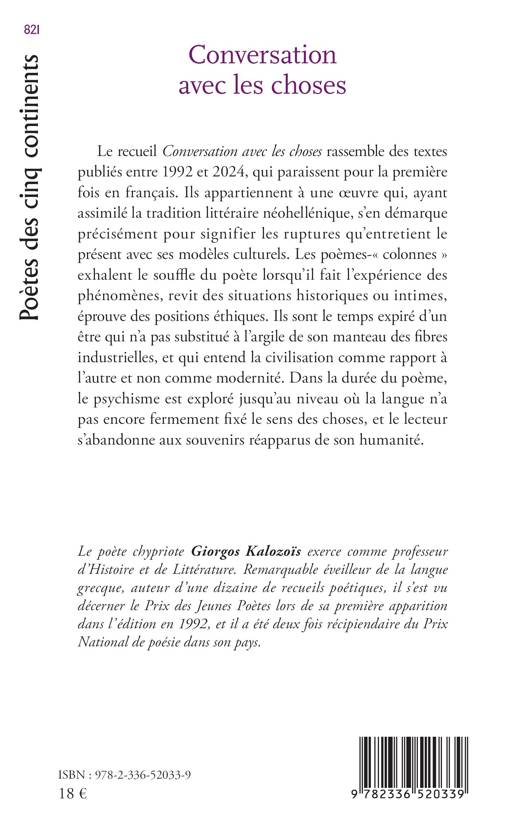 Le recueil Conversation avec les choses rassemble des textes publiés entre 1992 et 2024, qui paraissent pour la première fois en français. Ils appartiennent à une oeuvre qui, ayant assimilé la tradition littéraire néohellénique, s'en démarque précisément pour signifier les ruptures qu'entretient le présent avec ses modèles culturels. Les poèmes- colonnes exhalent le souffle du poète lorsqu'il fait l'expérience des phénomènes, revit des situations historiques ou intimes, éprouve des positions éthiques. Ils sont le temps expiré d'un être qui n'a pas substitué à l'argile de son manteau des fibres industrielles, et qui entend la civilisation comme rapport à l'autre et non comme modernité. Dans la durée du poème, le psychisme est exploré jusqu'au niveau où la langue n'a pas encore fermement fixé le sens des choses, et le lecteur s'abandonne aux souvenirs réapparus de son humanité.