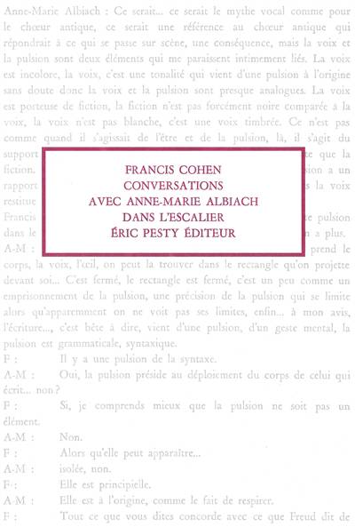 Transcription des 6 entretiens, échelonnés entre novembre 2006 et mars 2007, que Francis Cohen a eus avec Anne-Marie Albiach à propos de son écriture. Le livre s'ouvre sur une préface de Francis Cohen intitulée "L'acuité d'une pensée".