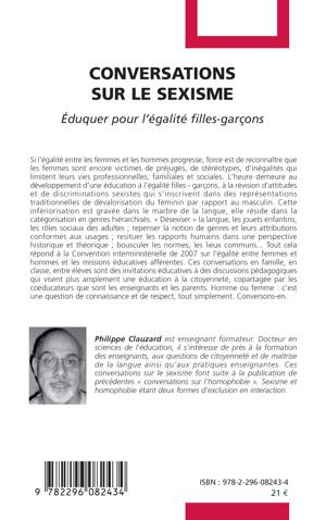 Les femmes sont encore victimes de préjugés, de stéréotypes, d'inégalités qui limitent leurs vies professionnelles, familiales et sociales. L'heure demeure au développement d'une éducation à l'égalité filles-garçons, à la révision d'attitudes et de discriminations sexistes. Ces conversations en famille, en classe entre élèves sont des invitations éducatives à des discussions pédagogiques qui visent plus amplement une éducation à la citoyenneté, copartagée par les coéducateurs que sont les enseignants et les parents. Conversons-en.
