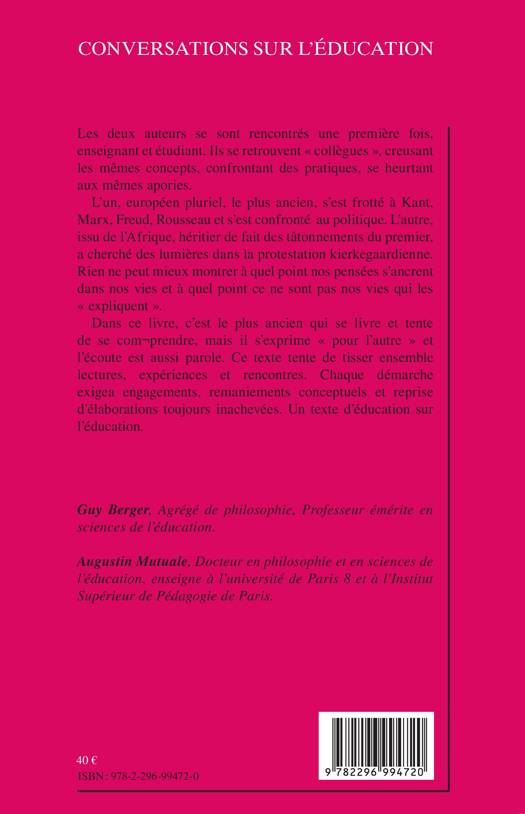 Les deux auteurs creusent les mêmes concepts, confrontent des pratiques, se heurtent aux mêmes impasses. L'un, européen pluriel, le plus ancien, s'est frotté à Kant, Marx, Freud, Rousseau et s'est confronté au politique. L'autre, issu de l'Afrique, héritier de fait des tâtonnements du premier, a cherché des lumières dans la protestation kierkegaardienne. Un texte d'éducation sur l'éducation.