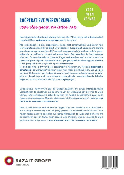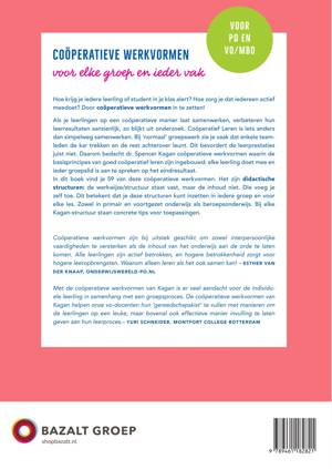 In dit boek vind je 59 van deze coöperatieve werkvormen. Het zijn didactische structuren: de werkwijze/structuur staat vast, maar de inhoud niet. Die voeg je zelf toe. Dit betekent dat je deze structuren kunt inzetten in iedere groep en voor elke les. Zowel in primair en voortgezet onderwijs als beroepsonderwijs.