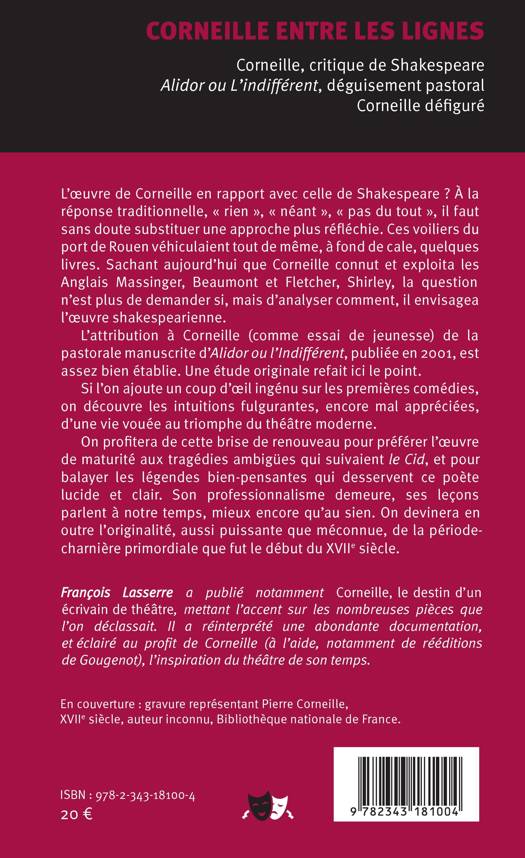 L'oeuvre de Corneille entretient-elle un rapport avec celle de Shakespeare ? Sachant aujourd'hui que Corneille connut et exploita les Anglais Massinger, Beaumont et Fletcher, la question n'est plus de demander si, mais de savoir comment il envisagea l'oeuvre shakespearienne. Une étude originale fait également le point sur l'attribution à Corneille de la pastorale manuscrite d'"Alidor ou L'indifférent".
