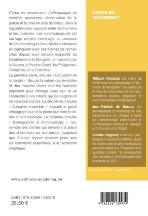 Corps en mouvement. Anthropologie du sensible questionne l'énonciation de la parole et la mise en acte du corps, dans la régulation des rapports entre les humains et les Invisibles. Les contributeurs de cet ouvrage rendent hommage au parcours de l'anthropologue Anne-Marie Vuillemenot en dialoguant avec ses thèmes de recherches depuis leurs terrains respectifs du Kazakhstan à la Mongolie, en passant par le Sahara, le Proche-Orient, les Philippines, l'Amazonie et la Colombie. La première partie de l'ouvrage se consacre à la description des formes que peuvent prendre le chamanisme et la transe. La seconde interroge les formes ritualisées de la circulations de la parole entre les humains et les Invisibles. La troisième porte sur les modalités de l'évocation dans le cadre de la réinvention et de la reconstruction de la mémoire partagée. Ce livre agence le chamanisme, l'oralité, la nostalgie et la mémoire pour proposer une anthropologie du sensible, du corps et de l'espace.