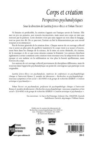 Les auteurs de cet ouvrage proviennent de disciplines différentes mais ils trouvent dans l'approche psychanalytique un point de convergence. Chacun vise à serrer au plus près de quelle(s) manière(s) le corps vient à se nouer à l'oeuvre, aussi bien dans les champs de la science, de la mise en scène théâtrale, du cinéma, de la musique et de ce que nous situons comme la féminité. Ils cherchent également à cerner comment cette création vient résonner avec la subjectivité de notre époque et son malaise où la sublimation ne vise plus la beauté apollinienne, mais l'envers du corps.