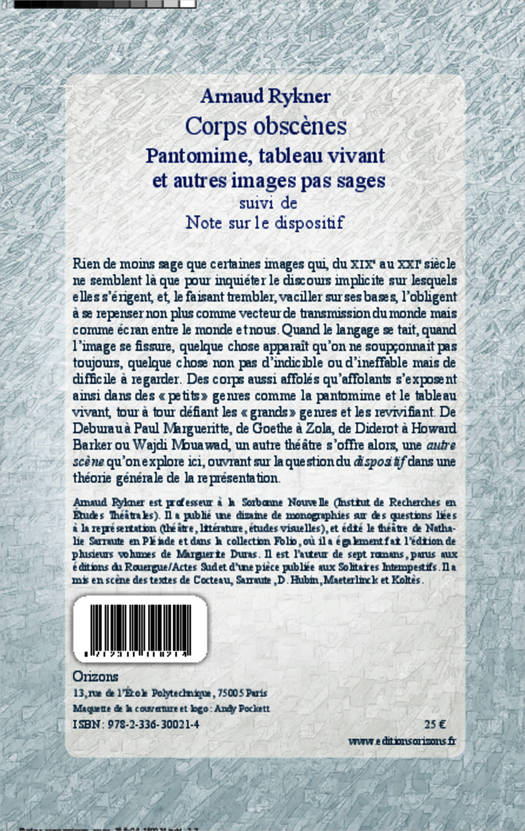 Rien de moins sage que certaines images qui, du XIXe au XXIe siècle ne semblent là que pour inquiéter le discours implicite sur lequel elles s'érigent, et, le faisant trembler, vaciller sur ses bases, l'obligent à se repenser non plus comme vecteur de transmission du monde mais comme écran entre le monde et nous. Des corps aussi affolés qu'affolants s'exposent ainsi dans des "petits" genres comme la pantomime et le tableau vivant, tour à tour défiant les "grands" genres et les revivifiant...