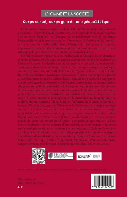 Fidèle à son esprit initial, L'Homme et la Société continue la lutte pour l'auto-émancipation. Ce volume traite du genre, dominant débats contemporains et études féministes. Ce n'est pas sans conséquence politique : selon Mitchell la lutte pour l'égalité des sexes risque d'être oubliée dans le reproche d'hétéronormativité, comme le fait Judith Butler. Les luttes pour l'homosexualité et pour l'égalité se concurrenceraient au profit du genre. Il s'agit de déjouer une approche du genre qui rend illisible l'oppression et l'occulte, en s'enfermant dans l'identité au détriment du social.