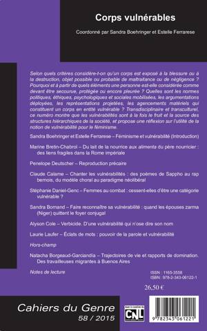 Selon quels critères considère-t-on qu'un corps est exposé à la blessure ou à la destruction, objet possible ou probable de maltraitance ou de négligence ? Pourquoi et à partir de quels éléments une personne est-elle considérée comme devant être secourue, protégée ou encore pleurée ? Ce numéro montre que les vulnérabilités sont à la fois le fruit et la source des structures hiérarchiques de la société et propose une réflexion sur l'utilité de la notion de vulnérabilité pour le féminisme.