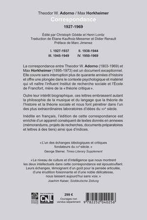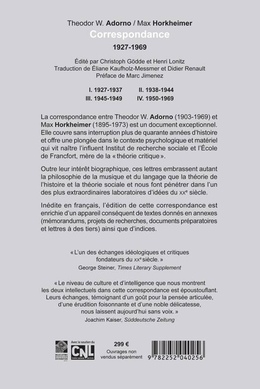 La correspondance entre Theodor W. Adorno (1903-1969) et Max Horkheimer(1895-1973) est un document exceptionnel. Elle couvre sans interruption plus de quarante annees d'histoire et offre une plongee dans le contexte psychologique et materiel qui vit naitre l'influent Institut de recherche sociale et l'Ecole de Francfort, mere de la " theorie critique ". Outre leur interet biographique, ces lettres embrassent autant la philosophie de la musique et du langage que la theorie de l'histoire et la theorie sociale et nous font penetrer dans l'un des plus extraordinaires laboratoires d'idees du xxe siecle. Inedite en francais, l'edition de cette correspondance est enrichie d'un appareil consequent de textes donnes en annexes (memorandums, projets de recherches, documents preparatoires et lettres a des tiers) ainsi que d'indices.