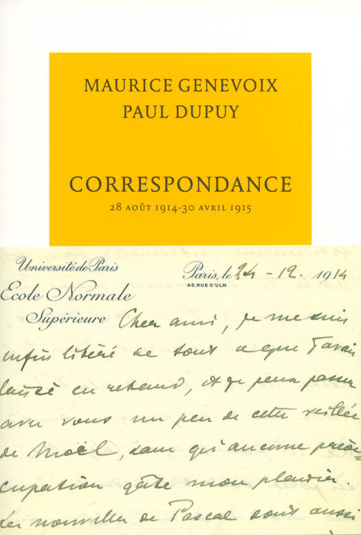 Au début du mois d'août 1914, Paul Dupuy, secrétaire général de l'École normale supérieure, avait demandé à tous les élèves mobilisés de lui écrire depuis le front. Ils l'informeraient de la guerre, il donnerait à chacun des nouvelles des autres. Chez le sous-lieutenant Maurice Genevoix, alors âgé de vingt-trois ans, Dupuy découvrit une personnalité attachante, à laquelle il adressa des lettres de plus en plus longues, stimulant l'écriture de son correspondant et se livrant à son tour. Ces lettres, échangées pendant les neuf premiers mois de la guerre, jusqu'à la blessure de Maurice Genevoix aux Éparges, nous emmènent au coeur de la vie de l'École normale supérieure au début de la guerre et rappellent le destin, souvent tragique, de beaucoup de ses élèves. Elles annoncent le grand livre de Genevoix, Ceux de 14, et sont, par le talent des deux correspondants et le contexte dramatique de leurs échanges, le récit d'une amitié naissante. Défiant la mort et les bombes, cette relation entre le professeur en fin de carrière et son élève atteint une intensité bouleversante.