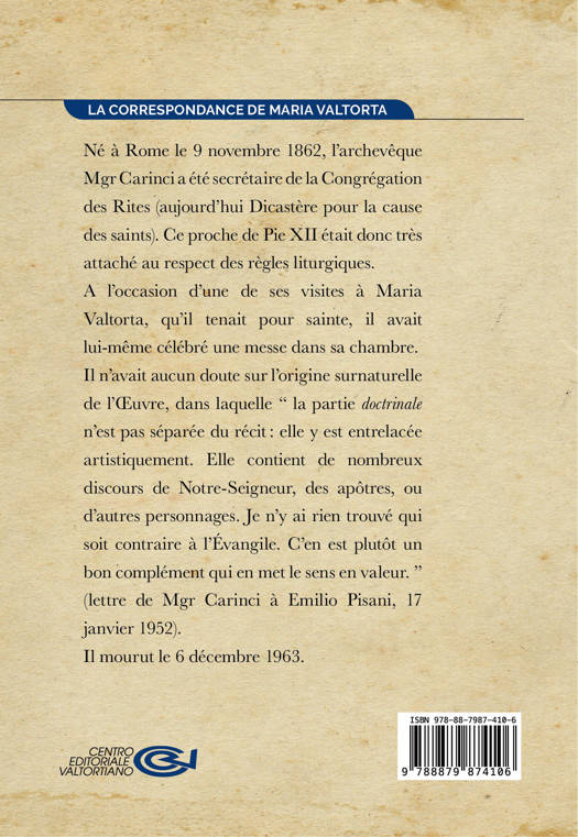 Né à Rome le 9 novembre 1862, l'archevêque Mgr Carinci a été secrétaire de la Congrégation des Rites (aujourd'hui Dicastère pour la cause des saints). Ce proche de Pie XII était donc très attaché au respect des règles liturgiques. A l'occasion d'une de ses visites à Maria Valtorta, qu'il tenait pour sainte, il avait luiâmême célébré une messe dans sa chambre. Il n'avait aucun doute sur l'origine surnaturelle de l'Œuvre, dans laquelle “ la partie doctrinale n'est pas séparée du récitâ¯: elle y est entrelacée artistiquement. Elle contient de nombreux discours de Notre-Seigneur, des apôtres, ou d'autres personnages. Je n'y ai rien trouvé qui soit contraire à l'Évangile. C'en est plutôt un bon complément qui en met le sens en valeur. ” (lettre de Mgr Carinci à Emilio Pisani, 17 janvier 1952). Il mourut le 6 décembre 1963.