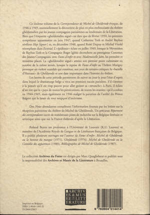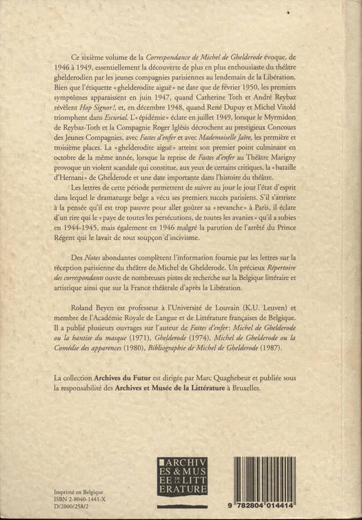 "Ce sixième volume de la Correspondance de Michel de Ghelderode évoque, de 1946 à 1949, essentiellement la découverte de plus en plus enthousiaste du théâtre ghelderodien par les jeunes compagnies parisiennes au lendemain de la Libération.