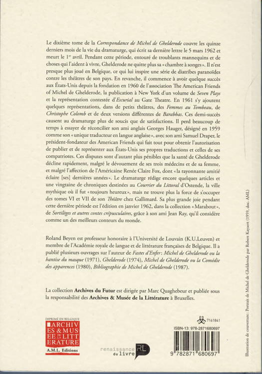 Le dixième tome de couvre les quinze derniers mois de la vie du dramaturge, qui écrit sa dernière lettre le 5 mars 1962 et meurt le 1er avril. Pendant cette période, Ghelderode ne quitte plus sa "chambre à songes", entouré de troublants mannequins et de choses qui l’aident à vivre. Il n’est presque plus joué en Belgique, ce qui lui inspire une série de diatribes paranoïdes contre les théâtres de son pays. En revanche, il commence à avoir quelque succès aux États-Unis. Il rédige encore quelques articles et une vingtaine de chroniques, mais il ne trouve plus la force de s’occuper des tomes VI et VII de son Théâtre. Sa plus grande joie pendant cette dernière période est l’édition en janvier 1962, de Sortilèges et autres contes crépusculaires, grâce à son ami Jean Ray, qu’il considère comme un des meilleurs conteurs du monde.