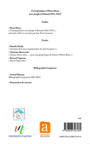 De 1924 à 1947, Bosco entretient avec Joseph d’Arbaud, son « parrain » en langue et littérature provençales, une importante correspondance encore inédite. Jean-Yves Casanova en a assuré la transcription, l’édition, la présentation et l’annotation. De Naples à Rabat où il est successivement en poste, le jeune Bosco fait part à son aîné et mentor, auteur de La Bête du Vaccarès dont il s’inspirera dans Malicroix, de ses expériences et inspirations poétiques et romanesques, et de sa double relation d’écrivain avec la « langue du père », le provençal, et la langue française.