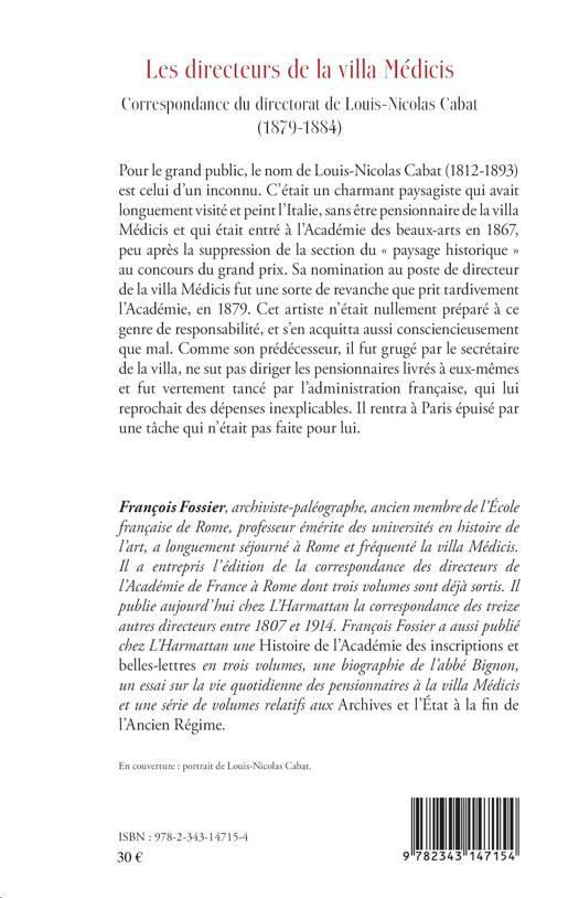 Louis-Nicolas Cabat (1812-1893), charmant paysagiste qui avait longuement visité et peint l'Italie, sans être pensionnaire de la villa Médicis et qui était entré à l'Académie des beaux-arts en 1867, a pris ses fonctions comme directeur de la Villa en 1879. Sa nomination fut une sorte de revanche que prit tardivement l'Académie. Cet artiste n'était nullement préparé à ce genre de responsabilité, et s'en acquitta aussi consciencieusement que mal. Il ne sut pas diriger les pensionnaires livrés à eux-mêmes et fut vertement tancé par l'administration française, qui lui reprochait des dépenses inexplicables. Il rentra à Paris épuisé par une tâche qui n'était pas faite pour lui.