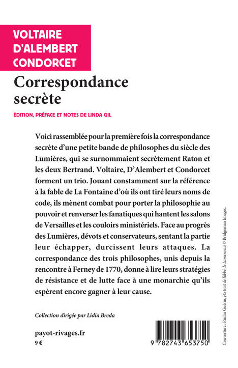 Voici rassemblée pour la première fois la correspondance secrète d'une petite bande de philosophes du siècle des Lumières, qui se surnommaient secrètement Raton et les deux Bertrand. Voltaire, D'Alembert et Condorcet forment un trio. Jouant constamment sur la référence à la fable de La Fontaine d'où ils ont tiré leurs noms de code, ils mènent combat pour porter la philosophie au pouvoir et renverser les fanatiques qui hantent les salons de Versailles et les couloirs ministériels. Face au progrès des Lumières, dévots et conservateurs, sentant la partie leur échapper, durcissent leurs attaques. La correspondance des trois philosophes, unis depuis la rencontre à Ferney de 1770, donne à lire leurs stratégies de résistance et de lutte face à une monarchie qu'ils espèrent encore gagner à leur cause.