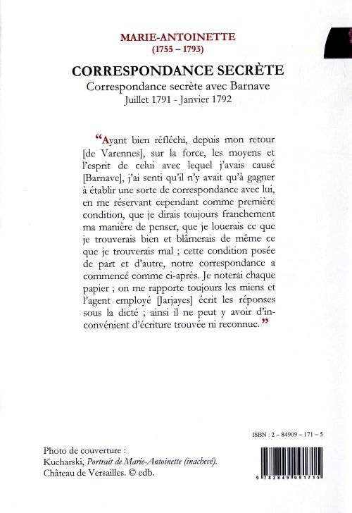 «Ayant bien réfléchi, depuis mon retour [de Varennes], sur la force, les moyens et l'esprit de celui avec lequel j'avais causé [Barnave], j'ai senti qu'il n'y avait qu'à gagner à établir une sorte de correspondance avec lui, en me réservant cependant comme première condition, que je dirais toujours franchement ma manière de penser, que je louerais ce que je trouverais bien et blâmerais de même ce que je trouverais mal; cette condition posée de part et d'autre, notre correspondance a commencé comme ci-après. Je noterai chaque papier; on me rapporte toujours les miens et l'agent employé [Jarjayes] écrit les réponses sous la dicté; ainsi il ne peut y avoir d'inconvénient d'écriture trouvée ni reconnue.»