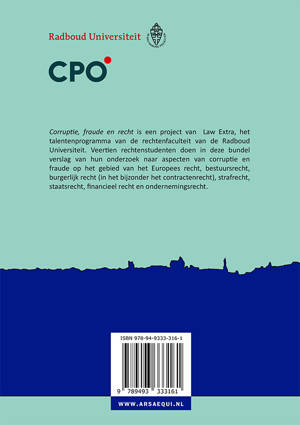 Corruptie, fraude en recht is een project van Law Extra, het talentenprogramma van de rechtenfaculteit van de Radboud Universiteit. Veertien rechtenstudenten doen in deze bundel verslag van hun onderzoek naar aspecten van corruptie en fraude op het gebied van het Europees recht, bestuursrecht, burgerlijk recht (in het bijzonder het contractenrecht), strafrecht, staatsrecht, financieel recht en ondernemingsrecht.