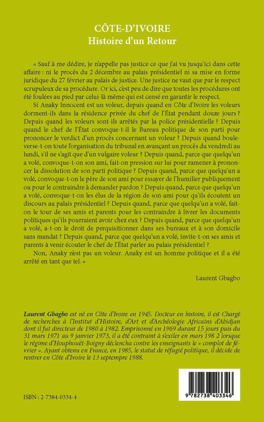 Chargé de recherches à l'Institut d'histoire, d'art et d'archéologie africains d'Abidjan dont il fut directeur de 1980 à 1982, l'auteur fut contraint de s'exiler en 1982 après le "complot de février" contre les enseignants. C'est son retour qu'il relate ici.