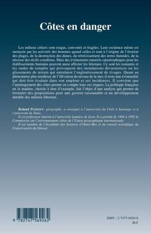 Les milieux côtiers sont exigus, convoités et fragiles. Leur existence même est menacée par les activités des hommes quand celles-ci sont à l'origine de l'érosion des plages, de la destruction des dunes, du rétrécissement des terres humides, de la nécrose des récifs coralliens. Mais des événements naturels catastrophiques peuvent aussi affecter les littoraux. Il convient que l'aménagement des côtes prenne en compte tous ces risques. L'auteur analyse la politique française en la matière, formule des propositions pour une gestion et un développement durable des littoraux.