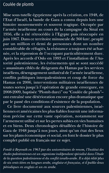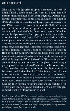 En décembre 2008, dans le cadre de ce qu'on appellera la Guerre de Gaza, l'armée israélienne lance contre Gaza une opération militaire d'envergure - baptisée "Coulée de plomb" ou "Plomb durci" - qui divisera l'opinion internationale. Ce livre, documenté aux meilleures sources palestiniennes, israéliennes et américaines, remonte aux origines du conflit pour analyser les causes, les effets et les conséquences de cette opération.