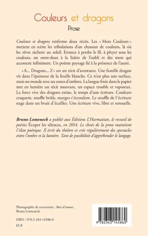 Couleurs et dragons renferme deux récits. Les Mots Couleurs mettent en scène les tribulations d'un chasseur de couleurs, là où les rêves sèchent au soleil... Un poème paysage lié à la présence de l'autre. Ensuite A... Dragons Z... est un récit d'aventures : une famille dragon vit dans l'épaisseur de la feuille blanche. Le souffle de l'écriture nage dans un bruit d'écailles. Une écriture vive, libre et sensuelle. Photographie de couverture : " Bois d'amour " par l'auteur.