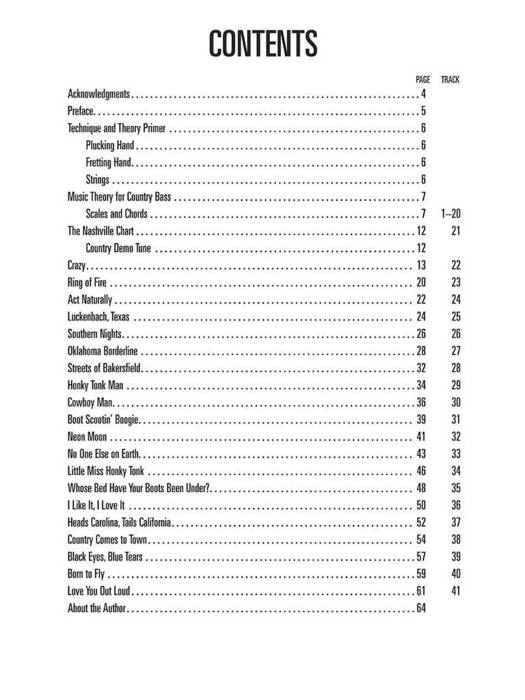(Bass Method). The Hal Leonard Country Bass Method is your complete guide to learning the styles and techniques of country bass. This book and online audio package uses actual songs from classic to modern country to teach you how to groove like the great Nashville session bassists. The online audio includes 41 full-band tracks for demonstration and play-along. 21 songs, including: Act Naturally * Boot Scootin' Boogie * Crazy * Honky Tonk Man * Love You Out Loud * Luckenbach, Texas (Back to the Basics of Love) * No One Else on Earth * Ring of Fire * Southern Nights * Streets of Bakersfield * Whose Bed Have Your Boots Been Under? * and more. Audio is accessed online using the unique code inside the book and can be streamed or downloaded. The audio files include PLAYBACK+, a multi-functional audio player that allows you to slow down audio without changing pitch, set loop points, change keys, and pan left or right.
