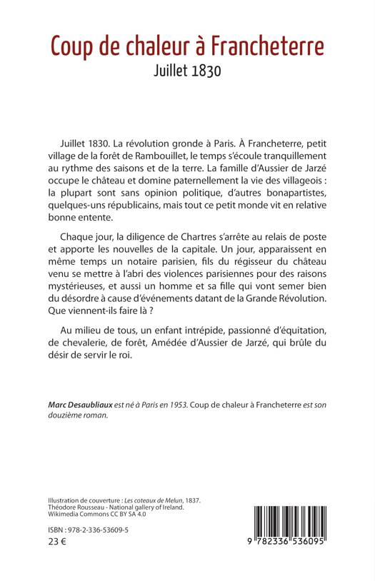 Juillet 1830. La révolution gronde à Paris. À Francheterre, petit village de la forêt de Rambouillet, le temps s'écoule tranquillement au rythme des saisons et de la terre. La famille d'Aussier de Jarzé occupe le château et domine paternellement la vie des villageois: la plupart sont sans opinion politique, d'autres bonapartistes, quelques-uns républicains, mais tout ce petit monde vit en relative bonne entente. Chaque jour, la diligence de Chartres s'arrête au relais de poste et apporte les nouvelles de la capitale. Un jour, apparaissent en même temps un notaire parisien, fils du régisseur du château venu se mettre à l'abri des violences parisiennes pour des raisons mystérieuses, et aussi un homme et sa fille qui vont semer bien du désordre à cause d'événements datant de la Grande Révolution. Que viennent-ils faire là ? Au milieu de tous, un enfant intrépide, passionné d'équitation, de chevalerie, de forêt, Amédée d'Aussier de Jarzé, qui brûle du désir de servir le roi.