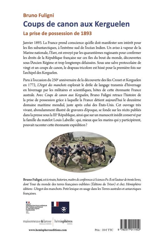 Janvier 1893. La France prend conscience qu’elle doit manifester son intérêt pour les îles subantarctiques, à l’extrême sud de l’océan Indien. Un aviso à vapeur de la Marine nationale, l’Eure, est envoyé par les quarantièmes rugissants pour confirmer les droits de la République française sur ces îles du bout du monde, découvertes sous l’Ancien Régime et trop longtemps délaissées. Sous une salve protocolaire de vingt et un coups de canon, le drapeau tricolore est hissé pour la première fois sur l’archipel des Kerguelen. Paru à l’occasion du 250e anniversaire de la découverte des îles Crozet et Kerguelen en 1772, “L’Argot des manchots” explorait le drôle de langage transmis d’hivernage en hivernage par les militaires et scientifiques, hôtes de cette étonnante France australe. Avec “Coups de canon aux Kerguelen”, Bruno Fuligni retrace l’histoire de la prise de possession grâce à laquelle la France détient aujourd’hui le deuxième domaine maritime mondial, juste après celui des États-Unis. Cet ouvrage très vivant, abondamment illustré de gravures d’époque, se fonde sur les récits publiés dans la presse sous la IIIe République, ainsi que sur un manuscrit inédit conservé par la famille du matelot Louis Labeille : qui, mieux que les marins qui y participèrent, pouvait raconter cette étonnante expédition ?